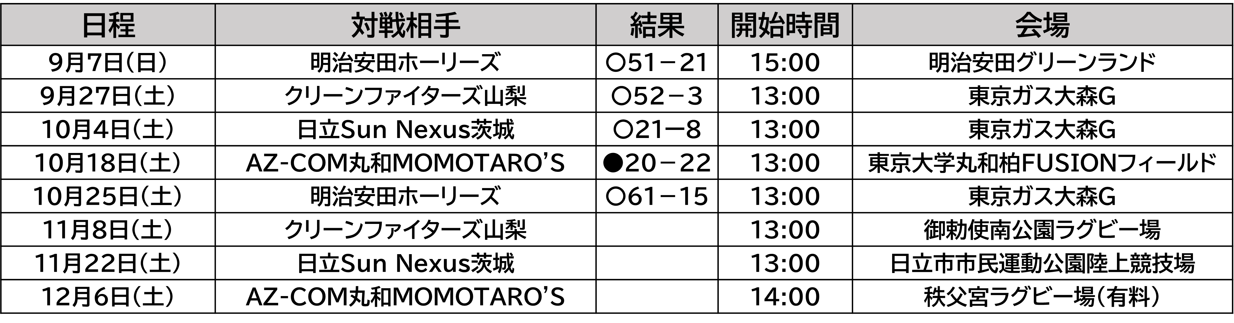 次戦は、11月8日(土)13時~御勅使南公園ラグビー場で、VS クリーンファイターズ山梨を予定しております。