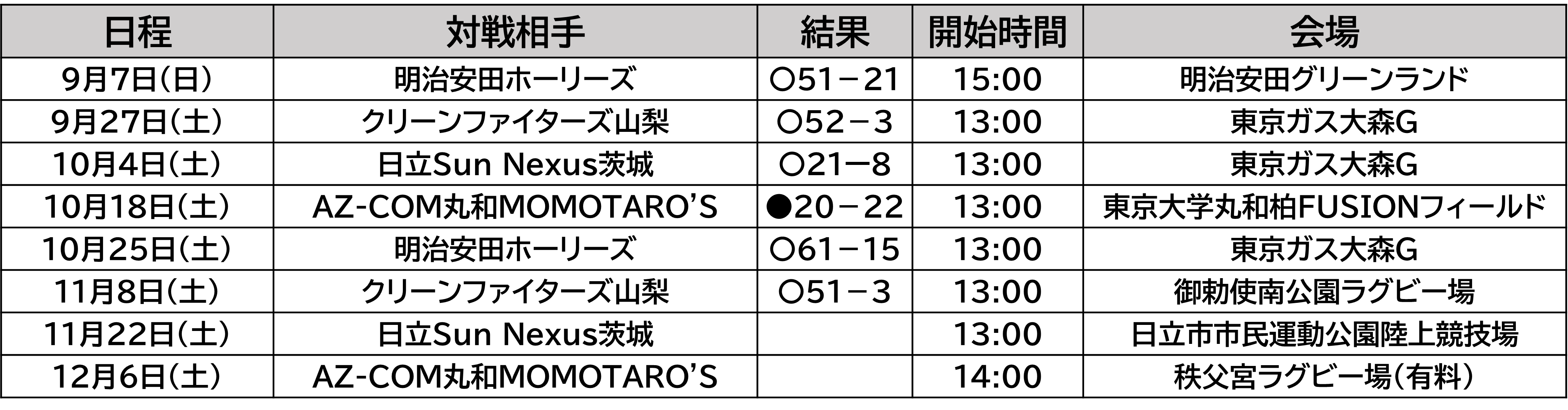 11月8日(土)御勅使南公園ラグビー場で行われたクリーンファイターズ山梨戦は51対3(前半24対3、後半27対0)で勝利いたしました。