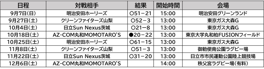 12月6日(土)14時~秩父宮ラグビー場で、VS AZ-COM丸和MOMOTARO'Sを予定しております。